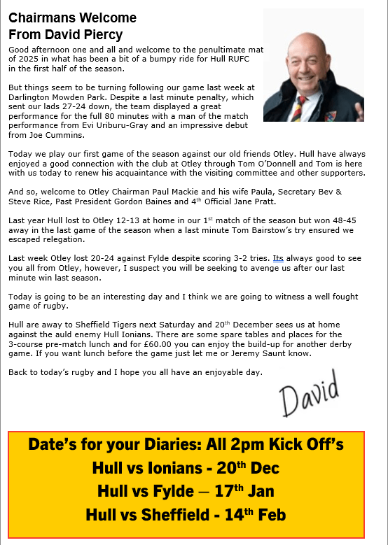 The digital version of our game day programme for our Eighth home game of the 2025/26 season with Otley will appear here.