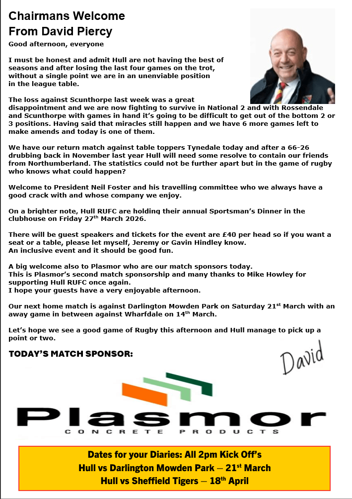 The digital version of our game day programme for our eleventh home game of the 2025/26 season with tynedale RUFC will appear here.